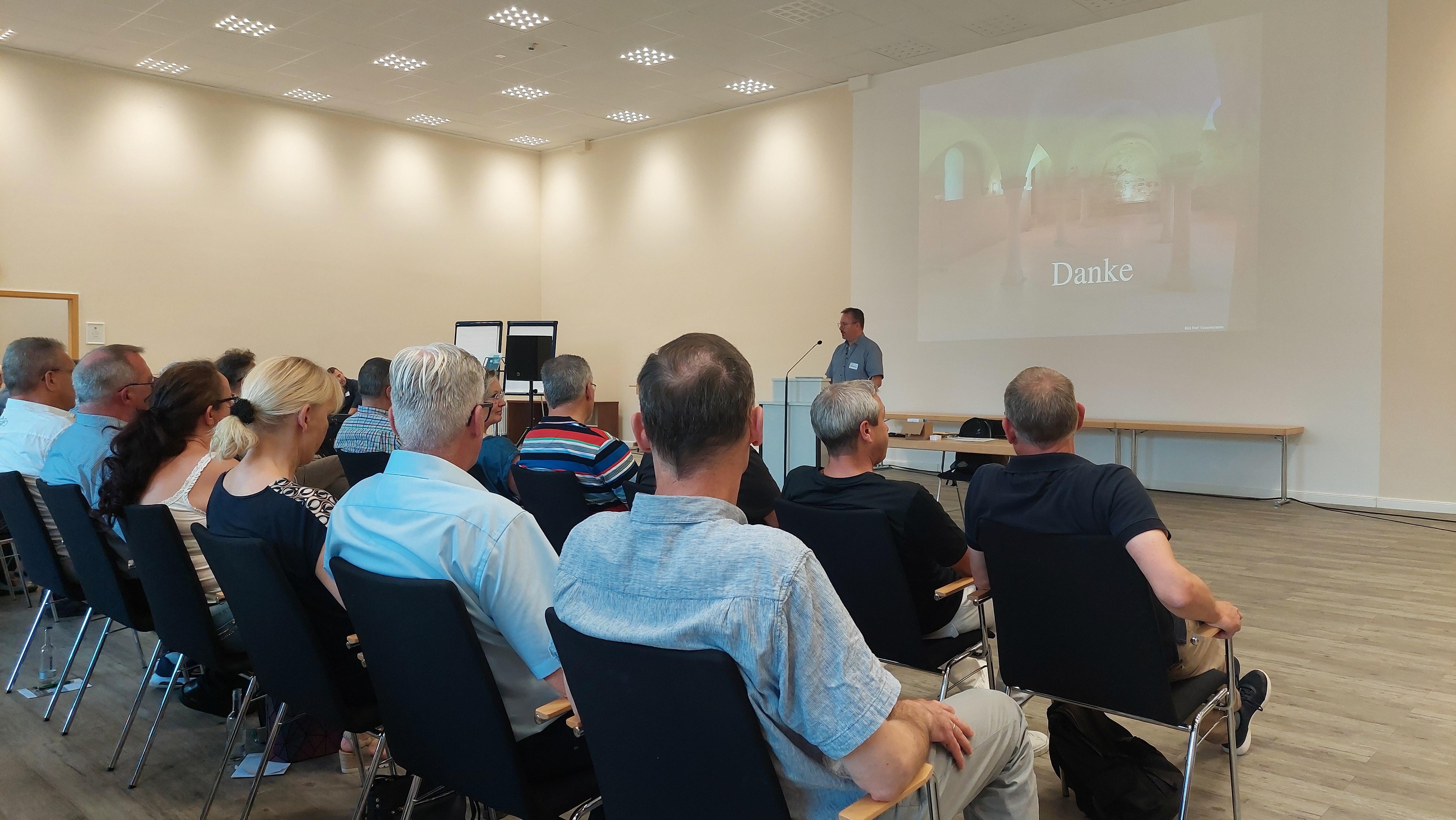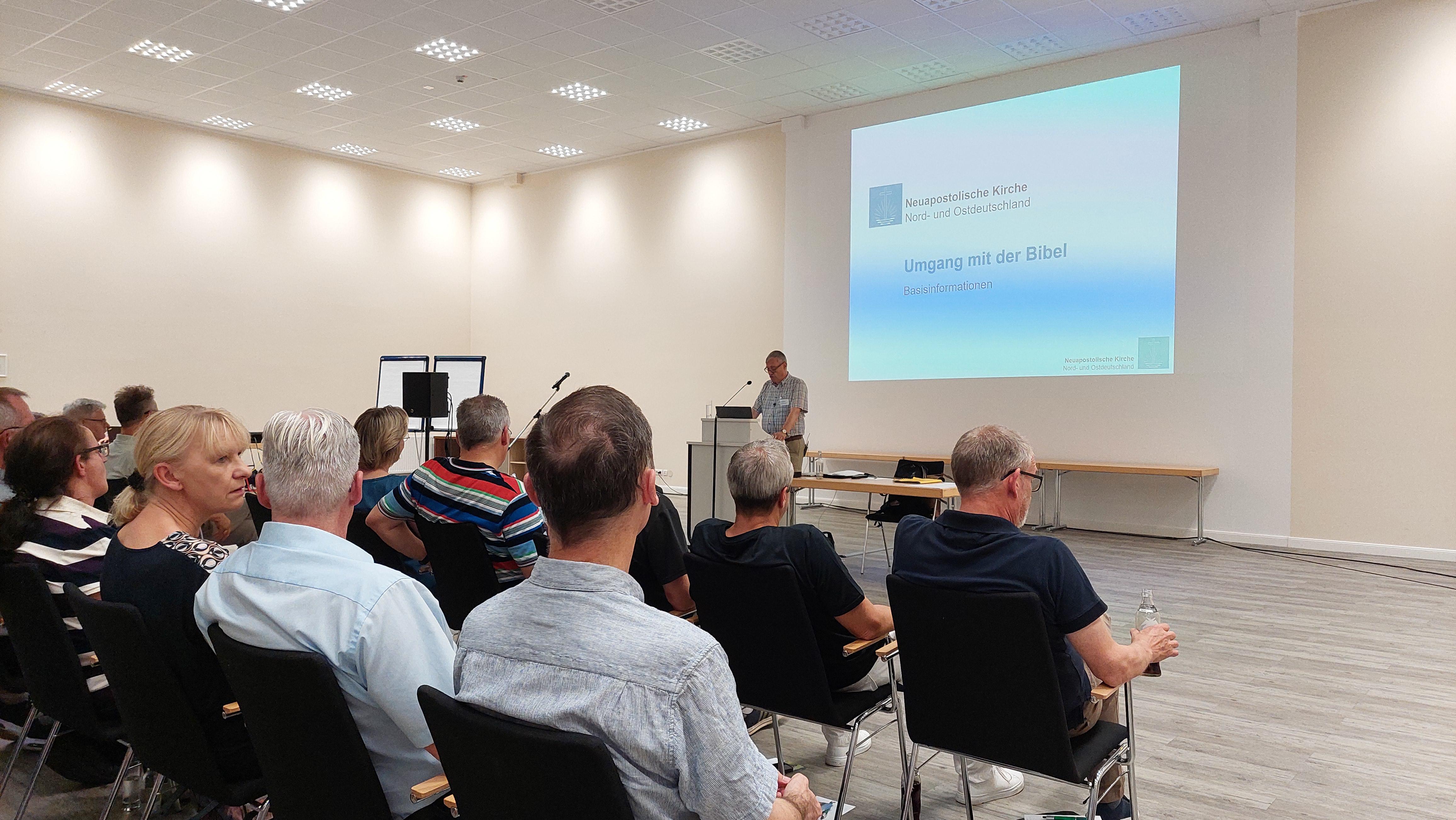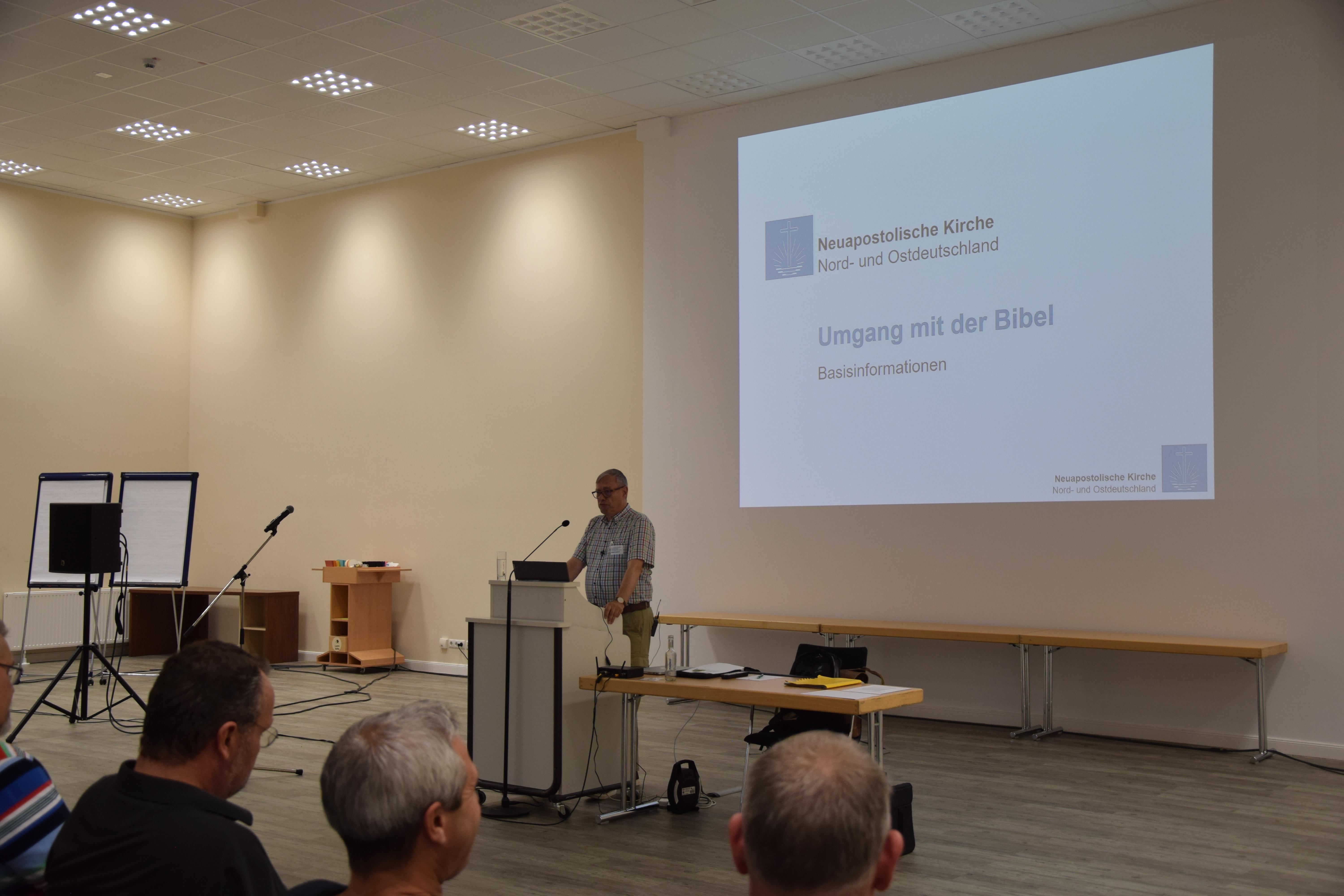 Bezirksältester i.R. Rainer Lorenz (Fachberater Fortbildung im Apostelbereich Mitte-Nord) hielt einen Vortrag zur Entstehungsgeschichte der Bibel, des Alten und des Neuen Testaments. Insbesondere beim Neuen Testament ging er auf die Autoren und die Entstehungszeit der einzelnen Schriften ein, gemäß dem aktuellen Forschungsstand.