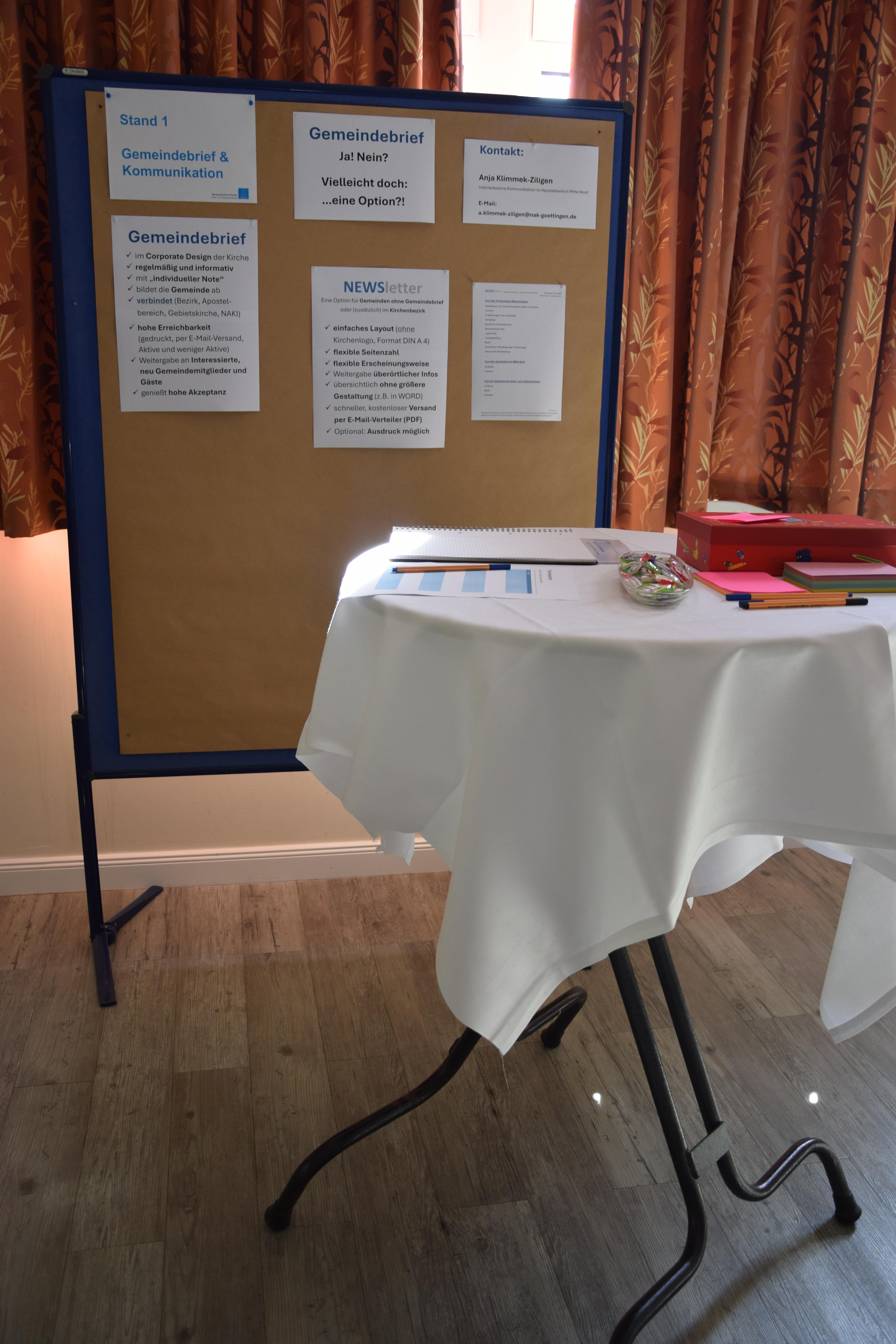 Der Markstand zur gleichnamigen Schrift der Neuapostolischen Kirche (2001) visualisierte die Hauptpunkte, über die man mit dem Bezirksältesten Harald Schwab (Braunschweig) ins Gespräch kam. Der Hinweis auf die Aufgabenbeschreibung für Gemeinde- und Bezirksvorsteher aus der Satzung der Gebietskirche sorgte für Aufmerksamkeit und fehlende Inhalte wurden durch handschriftliche Notizen zur ansprechenden Grafik ergänzt.