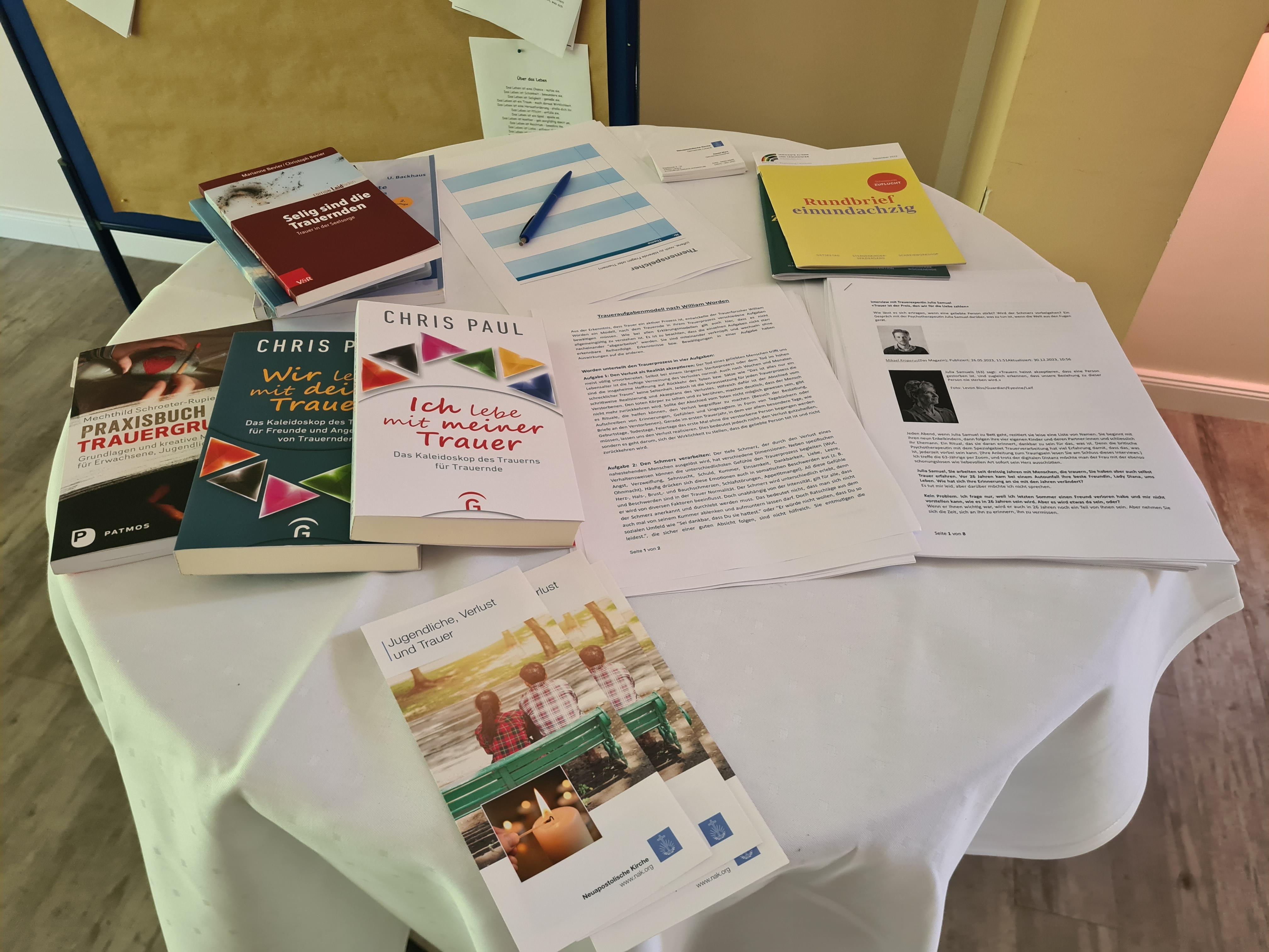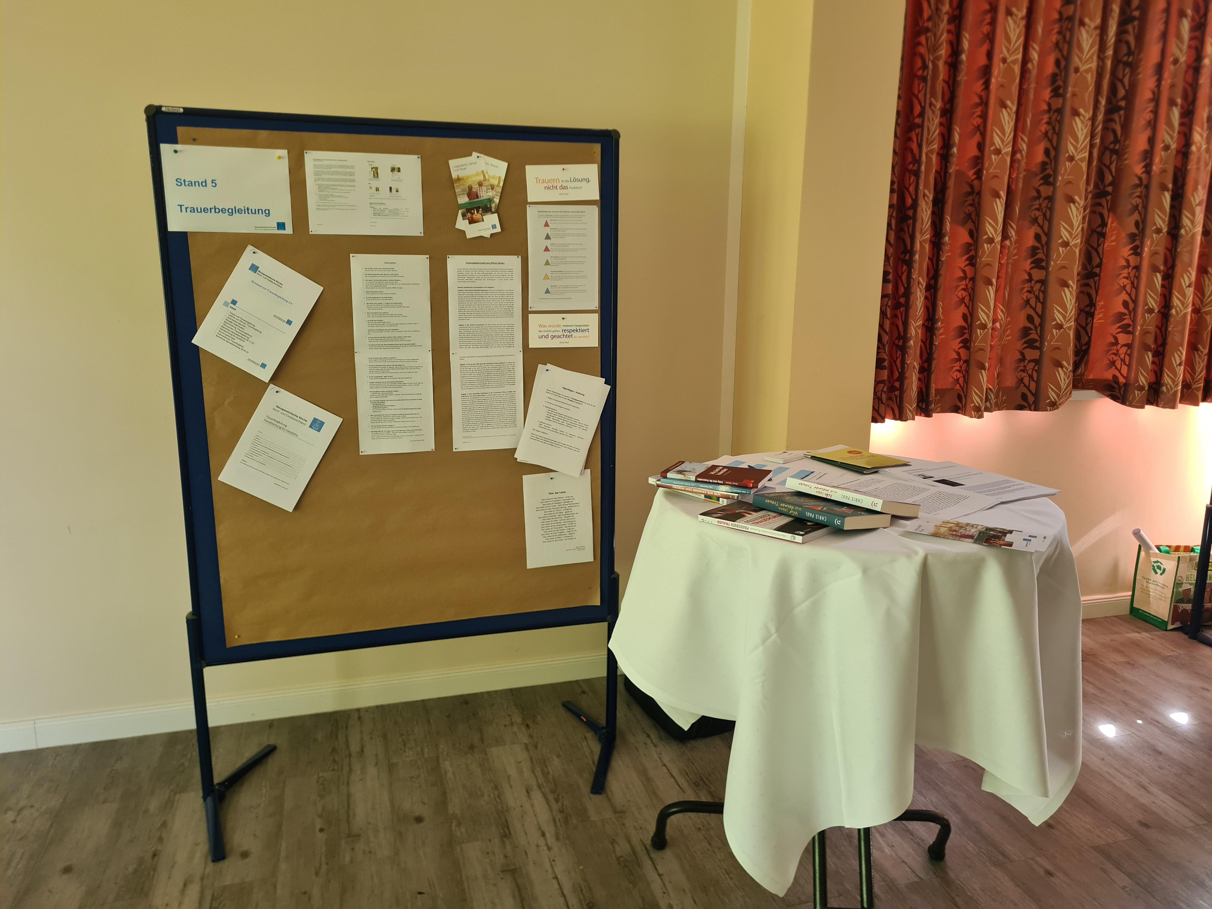 Priester Daniel Marx (Schwerin) kam am Marktstand, der mit umfangreicher Literatur ausgestattet war, vielfältig ins Gespräch: Erfahrungsaustausch, Aufzeigen von Fortbildungen für Seelsorger sowie die individuelle Trauerbegleitung in Gemeinden und Kirchenbezirken waren Schwerpunkte. Das Angebot der Trauerbegleitung soll in den Gemeinden noch besser bekannt sein, der Wunsch nach Basisschulungen (für neue Amtstragende und in der Seelsorge Tätige) wurde geäußert.