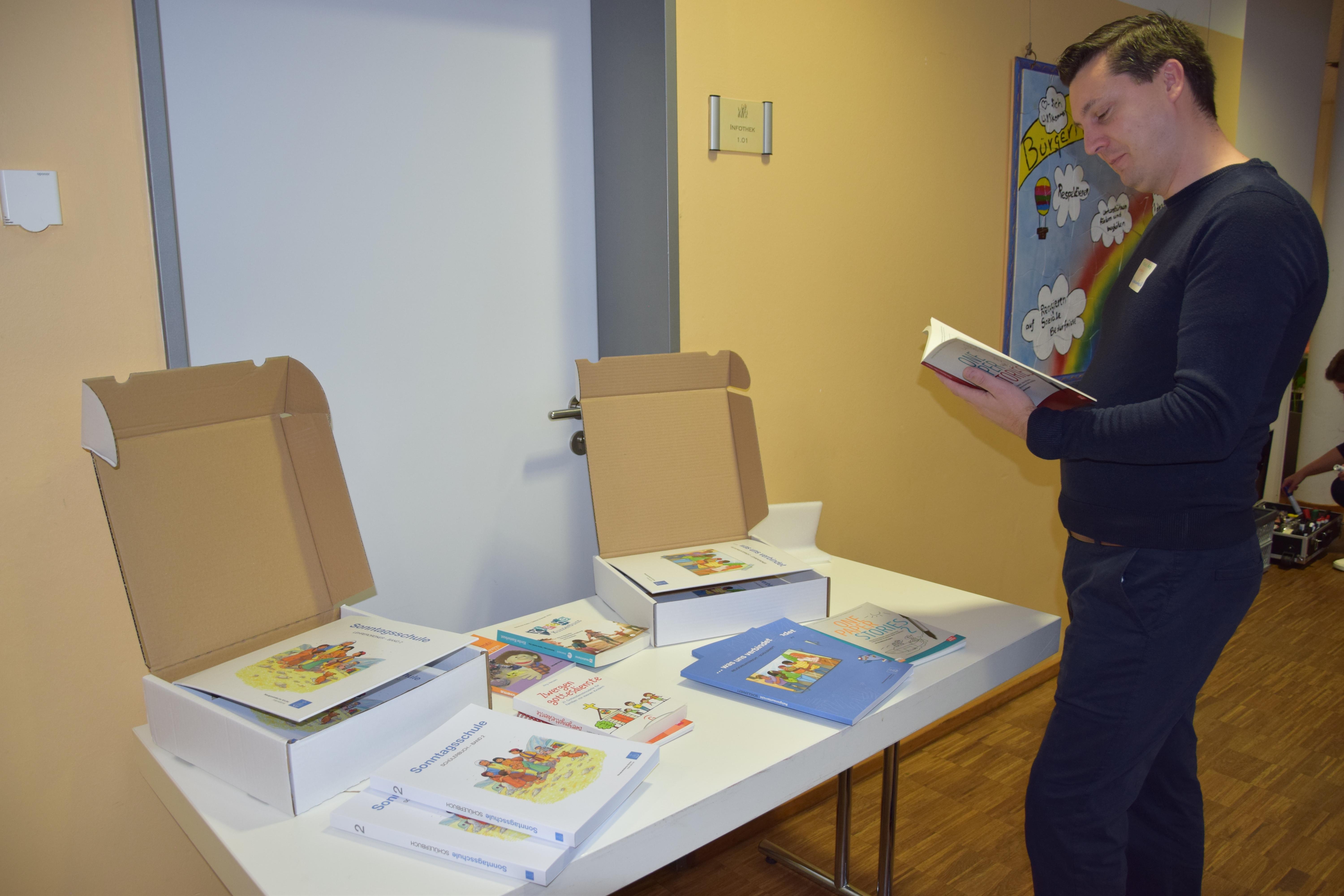 In einer ausgedehnten (Mittags-)Pause zum Stärken war Raum für Begegnungen und Gespräche, zum Erkunden von Materialien und zum Stöbern in Büchern und kirchlichen Lernmitteln.